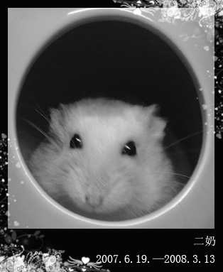 二奶短暂的一生尽心尽职的做好了每一个角色包子的夫人,四个孩子的麻麻,我们的好朋友用任何美好的词语来形容她都不为过二奶是一个好鼠没有其他鼠鼠惯有的毛病甚至越狱了,她会跑到书桌旁边来引起你的注意等着你抱着她,再送她回去我们曾惊呼她的完美与灵气三周前,我们发现了二奶的异样左胸口长了个瘤子,多方求助未果直到昨天,已经长到了她身体的2/3大小,并且开始疼痛第一天晚上,她叫了一次第二天晚上,她叫了三次第三天晚上,她疼得叫个不停最后,不忍二奶受着病痛折磨我们选择了让她安乐没有感到遗憾的是,二奶活的时候,我们给了她最好的我们把她安葬在绿地中的大树下希望她能安息,不再有痛苦二奶在天堂要快乐!!!-